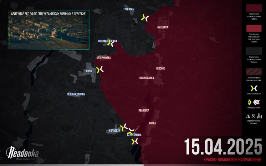 На Краснолиманском направлении ВС РФ развивают наступление на Новомихайловку. Новое фактически находится в оперативном окружении - с трёх сторон дороги взяты под физический контроль, с запада - под огневой. Южнее Ямполовки продолжаются атаки на Торское.