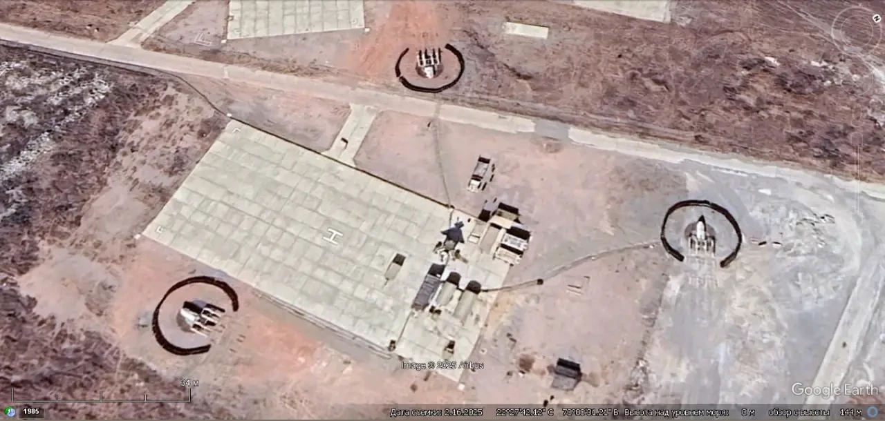 Спутниковый снимок Google Earth: позиция ЗРК С-125М на авиабазе Джамнагара. Снимок сделан в феврале 2025 года