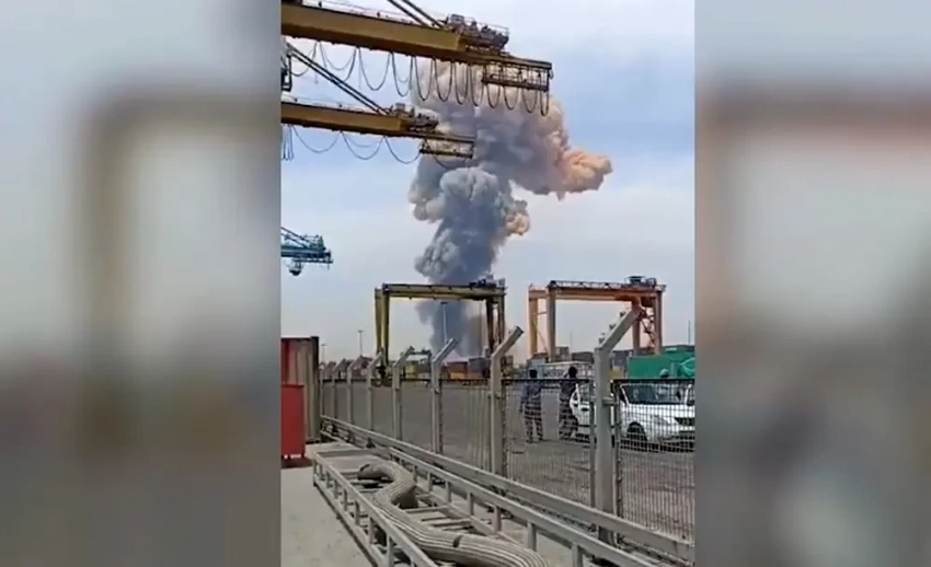 Очевидцы выкладывают в сеть кадры с большим густым облаком дыма, поднимающимся на месте взрыва в порту близ Бендер-Аббаса.