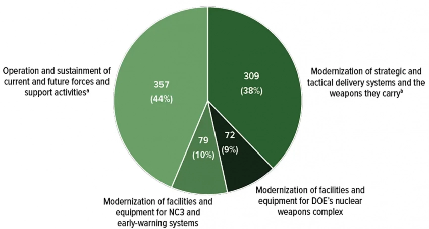 Длительные эксплуатационные расходы ядерного арсенала будут покрыты 44% от общей прогнозируемой стоимости, $357 млрд. Следующий по величине сегмент охватывает программы модернизации систем доставки оружия и самих боеголовок, что в сумме составляет $309 млрд. Оставшаяся часть делится между модернизацией ядерного командования, управления и связи (NC3) и систем раннего оповещения, а также модернизацией объектов Министерства энергетики.