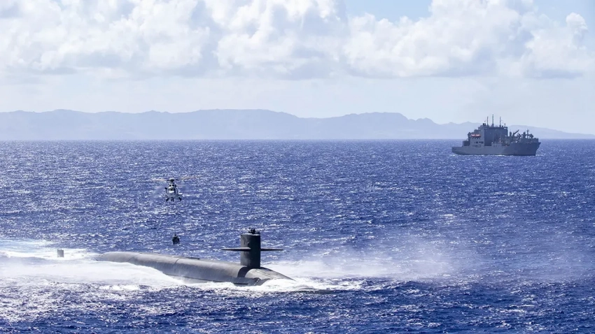 Вертолет AS-332 Super Puma, приписанный к сухогрузу USNS Cesar Chavez (T-AKE 14) типа «Льюис и Кларк», доставляет грузы на подводную лодку с баллистическими ракетами типа «Огайо» USS Louisiana (SSBN 743) во время пополнения запасов в море, 28 июня 2024 года.