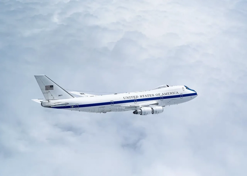 Самолет ВВС США E-4B, приписанный к 595-й группе командования и управления, авиабаза Оффатт, штат Небраска, совершает учебный полет над Средним Западом, 15 мая 2024 года.