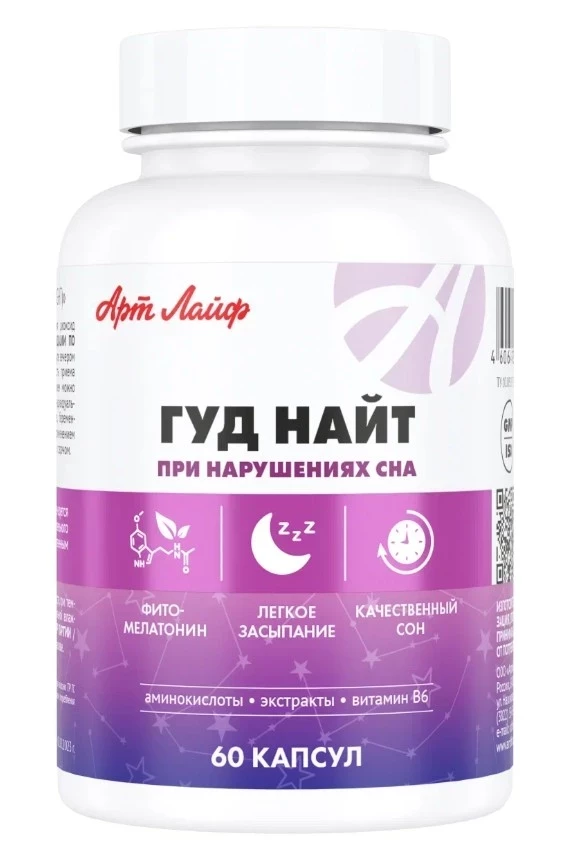 Комплекс «Гуд Найт» от Арт Лайф — не просто очередной БАД, а сильный игрок в топ БАДов для сна, созданный на синергии фитомелатонина, аминокислот и растительных экстрактов. Он мягко, но эффективно снимает напряжение после тяжелого дня, регулирует цикл сна и бодрствования, не оставляя утренней разбитости. Приятный бонус — улучшение настроения, памяти и даже состояния кожи. Одна капсула в день — и ваш организм входит в режим восстановления, как по команде «спать!».