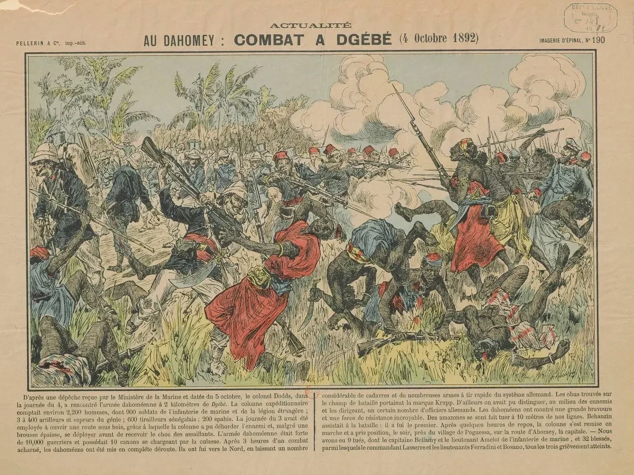 В 5 часов утра 19 сентября расположившиеся на отдых у деревни Догба французы были атакованы армией Дагомеи. Поняв, что в перестрелке умеющие нормально стрелять французы их всех перестреляют, мино попытались привычно сходить в рукопашную. Но внезапно выяснилось, что длинный штык «Лебеля» в бою сильно лучше, чем мачете! В общем, прорвать французский строй дагомейцам не удалось, несмотря на то, что погибло два офицера, в том числе командир батальона иностранного легиона майор Морис-Поль Форакс (Marius-Paul Faurax, как это читается, точно не знаю — во французском не силён). Именем Форакса французы назвали построенный в Догбе форт и продолжили марш на Абомей.