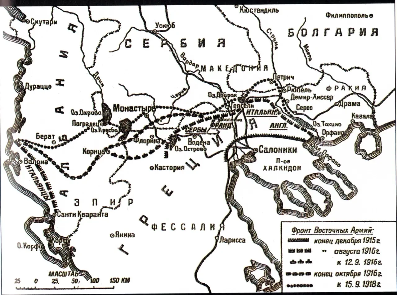 А вблизи – в приморских районах Влёра, Саранда и на острове Сазани (юго-запад Албании) – с весны 1916 г. располагался крупный и оснащённый современной по тому времени военной техникой контингент итальянских войск – союзников Антанты. Интересно, что к тому же, то есть к удару по не самому сильному участку австро-германо-болгарского фронта, призывали албанские антиавстрийские группировки.