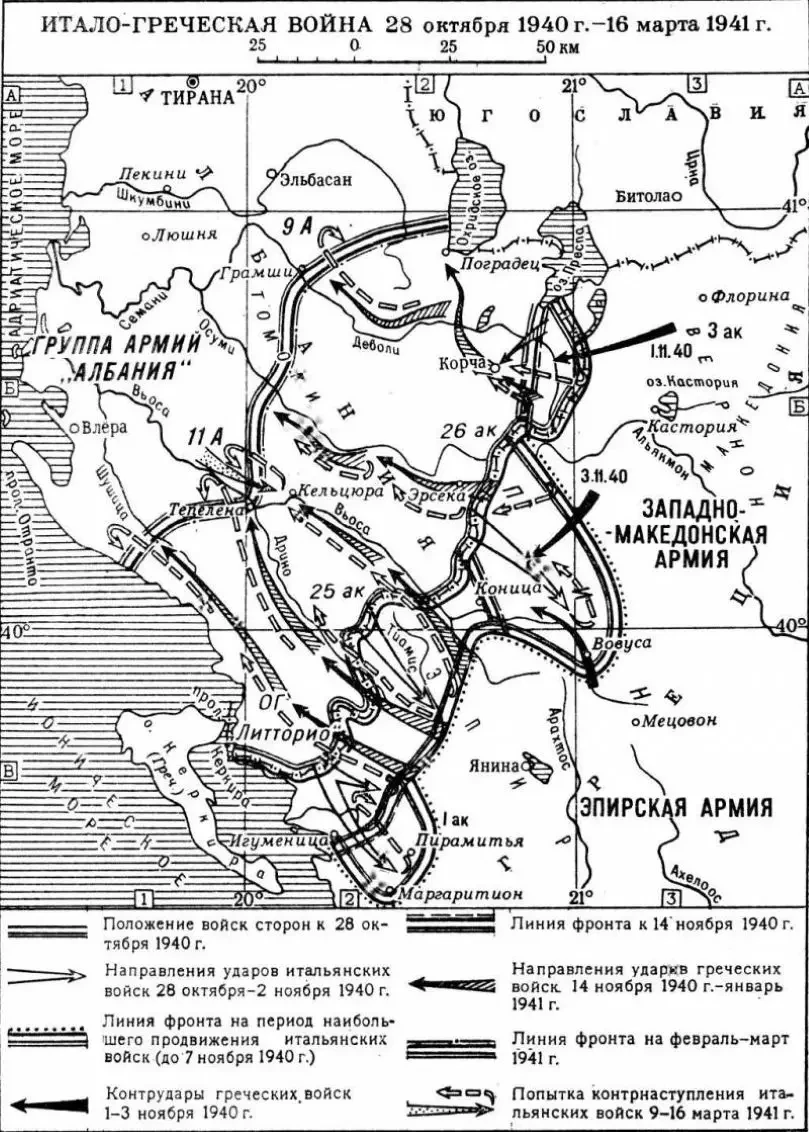 Практически тот же расклад, что и в Первой мировой войне, повторился с Грецией уже в ноябре 1940 – марте 1941 годов, когда греческие войска, отражая агрессию Италии, оказавшейся теперь по другую сторону фронта, освободили вместе с албанскими партизанами треть территории Албании, полностью оккупированной в апреле 1939 г. Италией.
