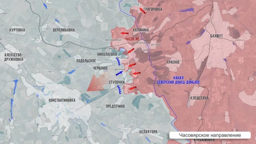 На севере от Часов Яра ВС РФ форсировали канал Северский Донец-Донбасс и расширили контроль в посадках в районе Марково и Новомарково.