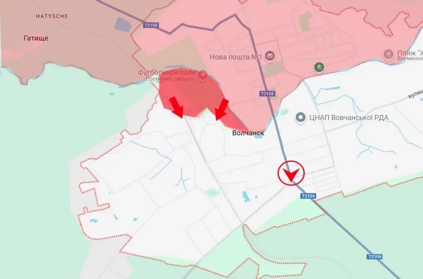 Плацдарм ВС РФ в южной части Волчанска и помеченный перекрёсток указанных дорог - на Харьков и Великий Бурлук
