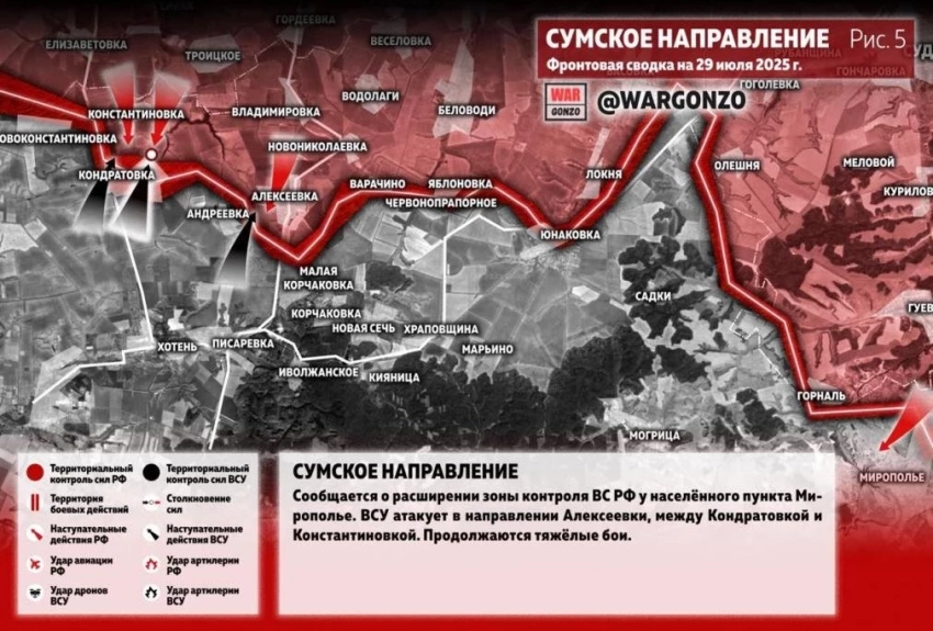 С Сумского направления сообщается о расширении зоны контроля ВС РФ у населённого пункта Мирополье. ВСУ атакует в направлении Алексеевки, между Кондратовкой и Константиновкой. Продолжаются тяжёлые бои.