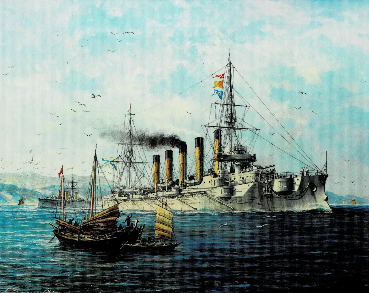 10. Аскольд» и «Новик» у берегов Приморья. Май 1903 г. Бумага, темпера, гуашь, 43х56 см. 2015 г.