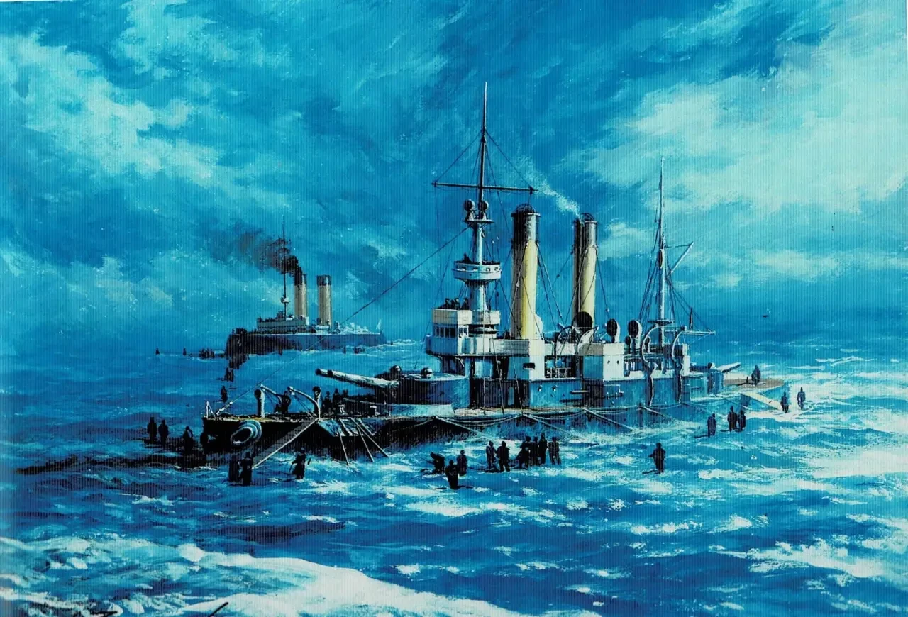 13. «Цесаревич» в бою о Порт-Артура 28.7.1904 г. Бумага, темпера, гуашь, 43х54 см. 2009 г.