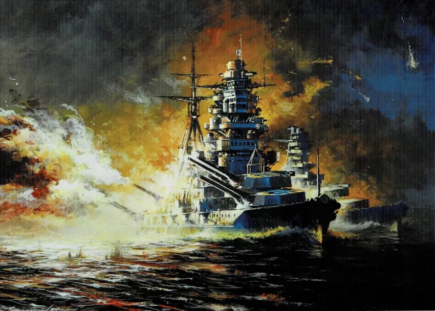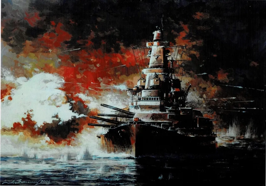 15. Линейный корабль «Саут Дакота» в ночном бою у о. Саво. Бумага, темпера, гуашь, 30х42, 2004 г.