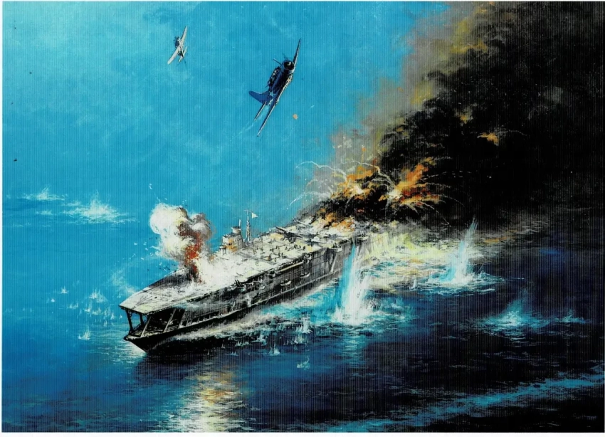 16. Потопление японского авианосца «Кага» 4 июня 1942 г. у Мидуэя. Бумага, темпера, гуашь, 30х42, 2001 г.
