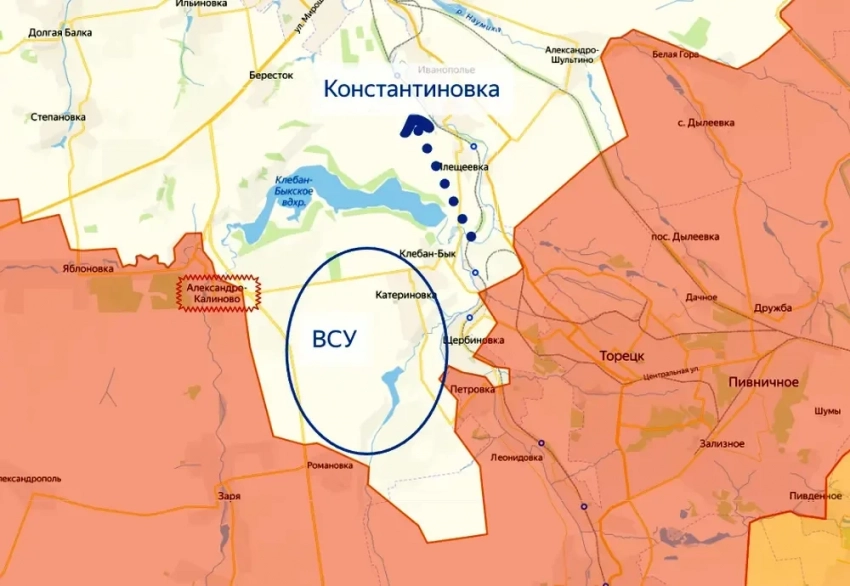 Освобождение данного села примечательно еще и тем, что наши войска продолжают зажимать противника в котле между Александро-Калиново на юге и поселком Клебан-Бык на севере, одновременно продвигаясь и к самой Константиновке. В конечном итоге у врага в этом котле позади останется только водохранилище Клебан-Бык, форсировать которое, мягко говоря, будет весьма непросто.