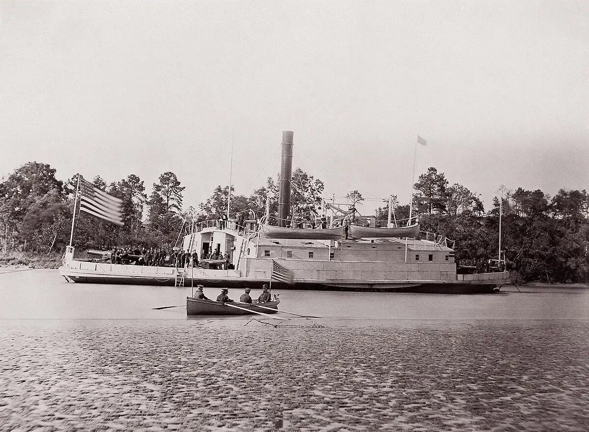 Конечно, многие из них, как и раньше, продолжали возить хлопок и разные другие грузы теперь уже военного назначения. В принципе, превратить миссисипский пароход в боевое судно было нетрудно. Достаточно было срезать надстройки двух верхних палуб, возвести на том, что осталось, баррикады из мешков с песком и поставить за ними артиллерийские орудия, те же, скажем, гладкоствольные «наполеоны», которые были на вооружении как северян, так и южан.