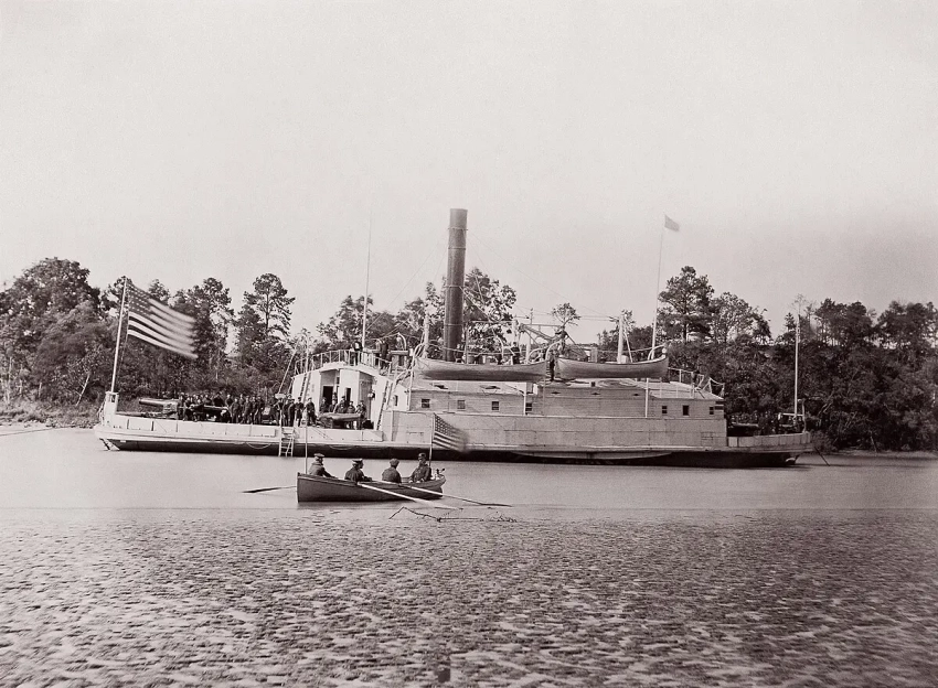 Пароходы «Лексингтон» и «Свизеленд». Те же две трубы, только уже безо всяких украшений, те же два гребных колеса, две палубы. Но только всё это обшито толстыми деревянными брусьями с прорезанными в них амбразурами для пушек