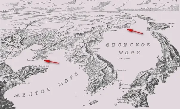 Одной из причин взять в аренду Ляодунский полуостров стало желание иметь на Тихом океане незамерзающий порт. Однако гораздо проще и дешевле было построить и направить во Владивосток пару ледоколов. К тому же ледяной покров не только мешал выходу в океан русских кораблей, но и на протяжении 4–5 месяцев в году защищал эту важнейшую базу от нападения с моря. Расстояние от Владивостока до Порт-Артура – около 1011 км (а эскадре Рожественского в 1905 году и вовсе пришлось пройти около 18 тысяч морских миль – 33 336 км, плавание продолжалось со 2 октября 1904 года по 14 мая 1905 года). Многим было понятно, что защитить эту крепость в случае войны будет крайне сложно. Посмотрите на карту – верхняя стрелка указывает на Владивосток, нижняя – на Порт-Артур:
