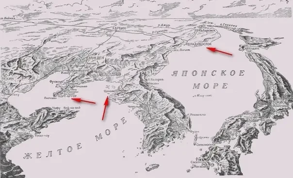 Между тем, вице-адмирал С. О. Макаров и контр-адмирал Е. И. Алексеев в качестве базы российского флота желали видеть Циндао (Киао-Чоу). Ещё раз посмотрите на карту – появилась третья красная стрелка, указывающая на Циндао:
