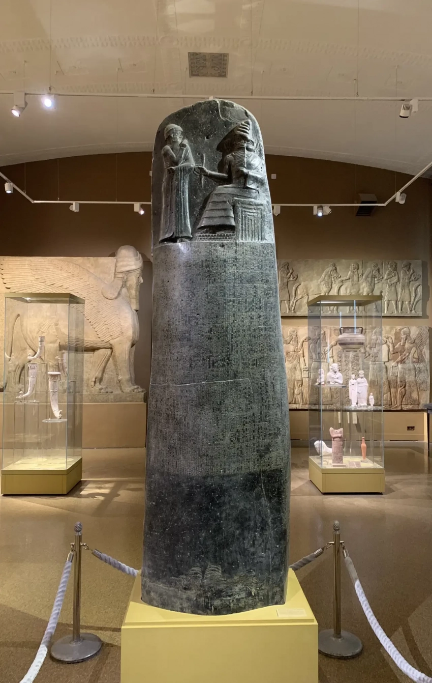 Столб с текстом законов Хаммурапи, которые он получает от бога Шамаша вместе с жезлом и кольцом