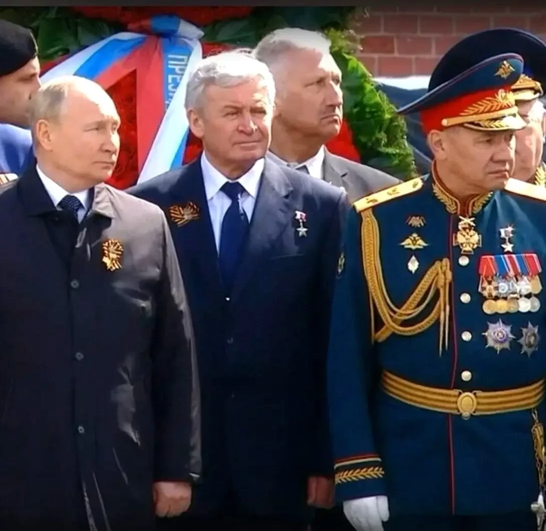 9 мая 2022 года. Александровский сад. Президент Российской Федерации Владимир Владимирович Путин, Герой России космонавт Василий Васильевич Циблиев, ветеран Афганистана Владимир Николаевич Кузнецов, министр обороны Российской Федерации Сергей Кужугетович Шойгу. За Шойгу стоит Герой Советского Союза генерал-лейтенант Юрий Васильевич Бабанский — участник пограничного конфликта между СССР и КНР на острове Даманский. Торжественным маршем проходит рота почётного караула.