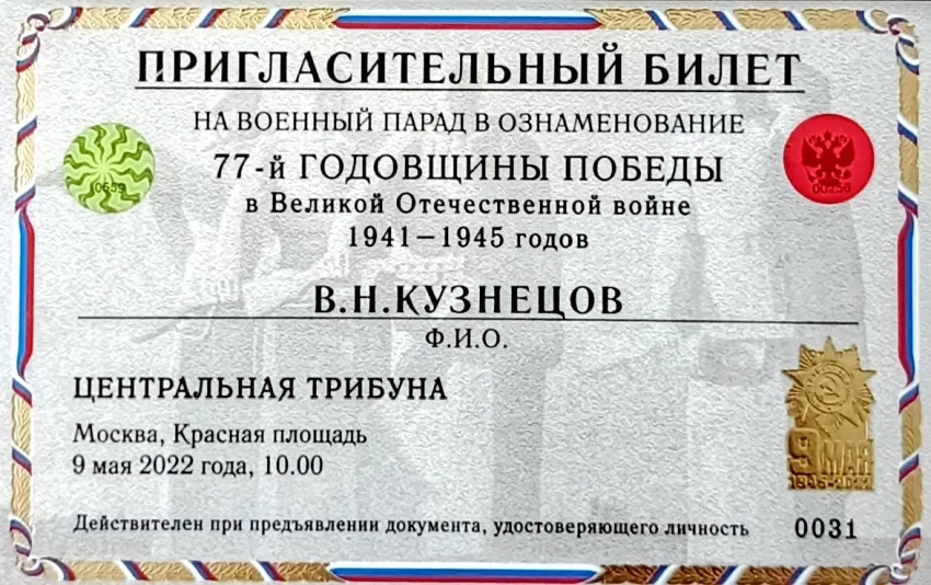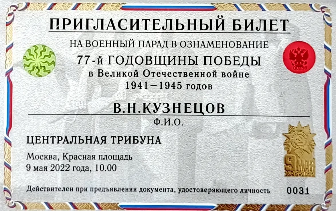 В апреле 2022 года я получил пригласительный билет на Парад Победы. Приглашение было на Центральную трибуну, поэтому всех нас отправили в санаторий Министерства обороны. В это время в стране действовали строгие противоэпидемические меры, и приглашённым предстояло провести две недели в карантине: возможное общение с первыми лицами государства должно было исключать больных людей.