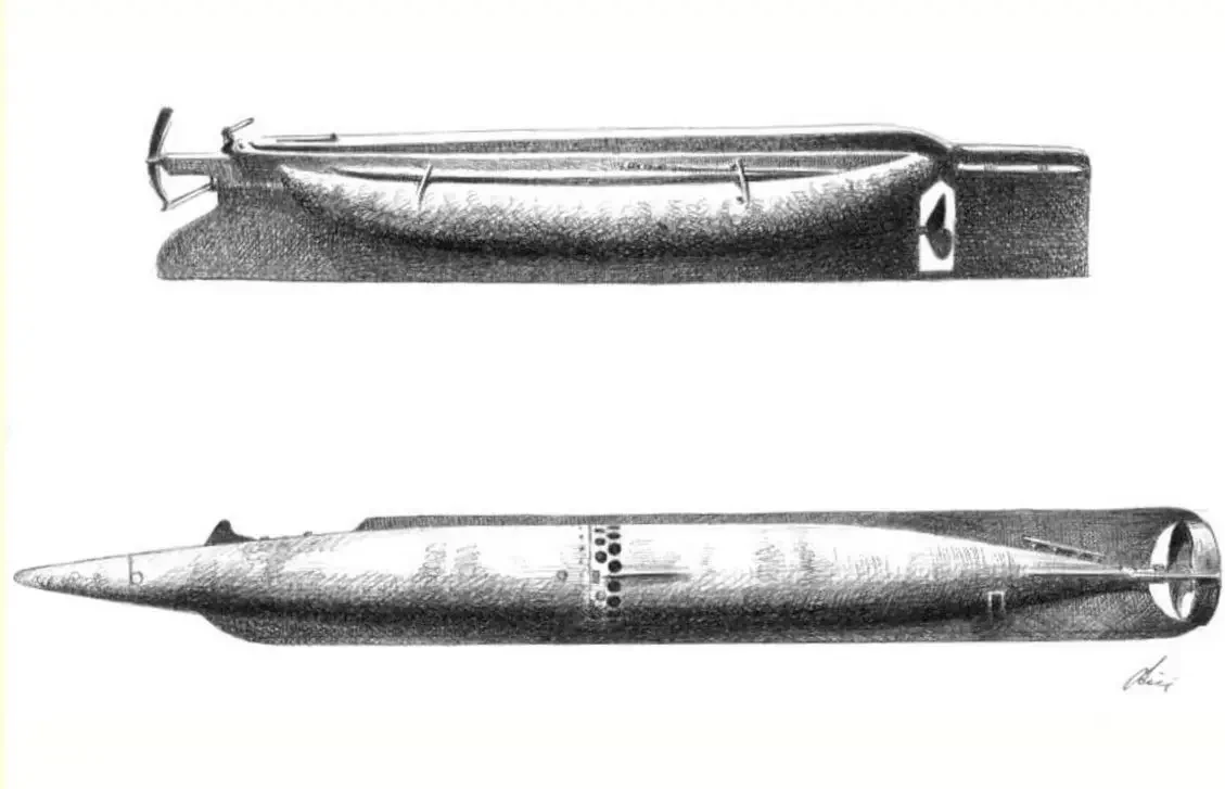 «Salvacoste» Лупписа (сверху) и первая торпеда Лупписа-Уайтхеда (снизу)