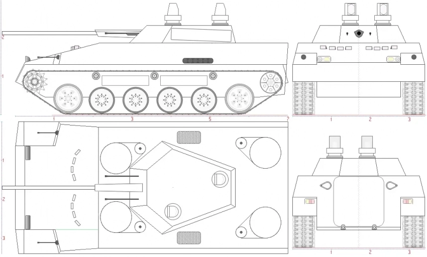 Если Вы обратили внимание на рисунки ходовой и корпуса ТБМП, то должны были заметить, что запас топлива частично вынесен за пределы броневого корпуса. Четыре бака ёмкостью по 30 литров расположены между поддерживающими катками в пространстве между бортом и опорными катками малого диаметра. Это стало возможным благодаря большой ширине танковой гусеницы. Суммарный объём, конечно, не впечатляет, но для первоочередного расхода при выдвижении к линии боевого соприкосновения сбережёт топливо за бронёй, да и в плане дополнительного препятствия при попадании кумулятивного снаряда сыграет некоторую роль.