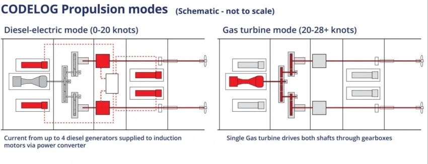 Для Type 26 выбран вариант комбинированной дизель-электрической ИЛИ газотурбинной установки CODELOG (COmbined Diesel-Electric Or Gas turbine). По сути, у такой системы существует всего два основных режима работы. Для достижения высоких скоростей газовая турбина Rolls Royce MT30 передает вращение гребным винтам непосредственно через редукторы.