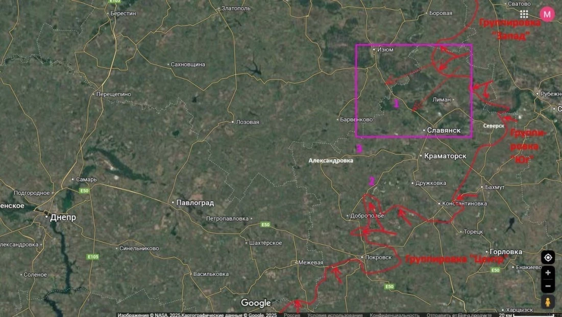 Вторые сутки Вооружённые силы Украины (ВСУ) истерят по поводу начала работы наших FPV-дронов по трассе Изюм-Славянск (на карте обозначена «1»).