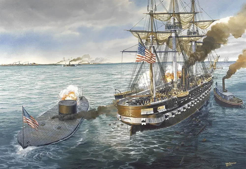 Однако на следующий день команду «Вирджинии» ожидал сюрприз. «Монитор» прибыл на буксире из Нью-Йорка накануне вечером, потрёпанный в пути, но готовый к бою. Корабль встал между броненосцем Конфедерации и повреждённой «Миннесотой». Более четырёх часов железные чудовища обстреливали друг друга. Корабль мятежников даже таранил «Монитор», а снаряд с него попал прямо в рубку, временно ослепив капитана Джона Уордена и вынудив его передать командование лейтенанту Сэмюэлю Грину. Однако «Монитор» отвечал, а его орудия Дальгрена продолжали обстреливать «Вирджинию».