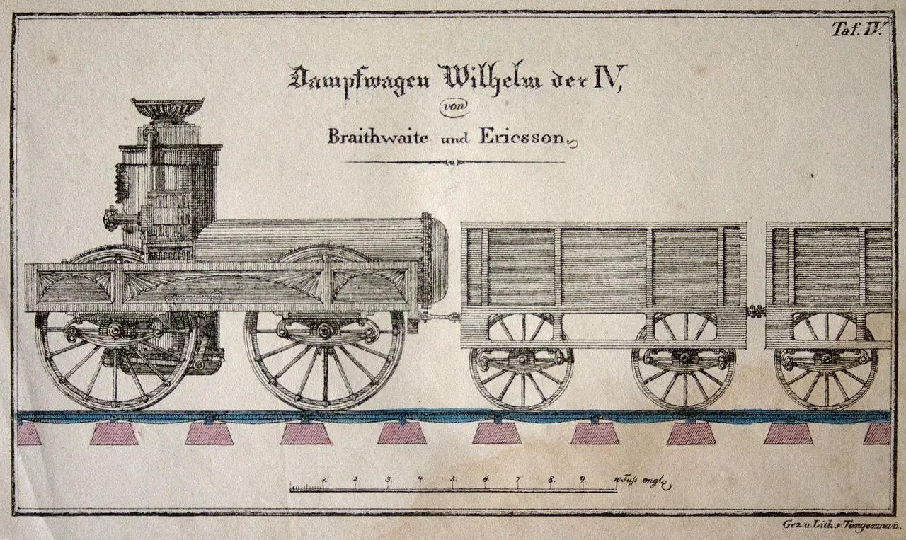 Немецкий рисунок (1833 г.) паровоза «Уильям IV» с указанием масштаба в футах, выполненный компанией «Брейтуэйт и Эрикссон»
