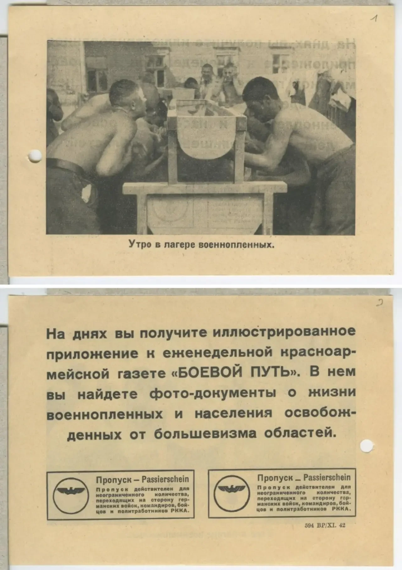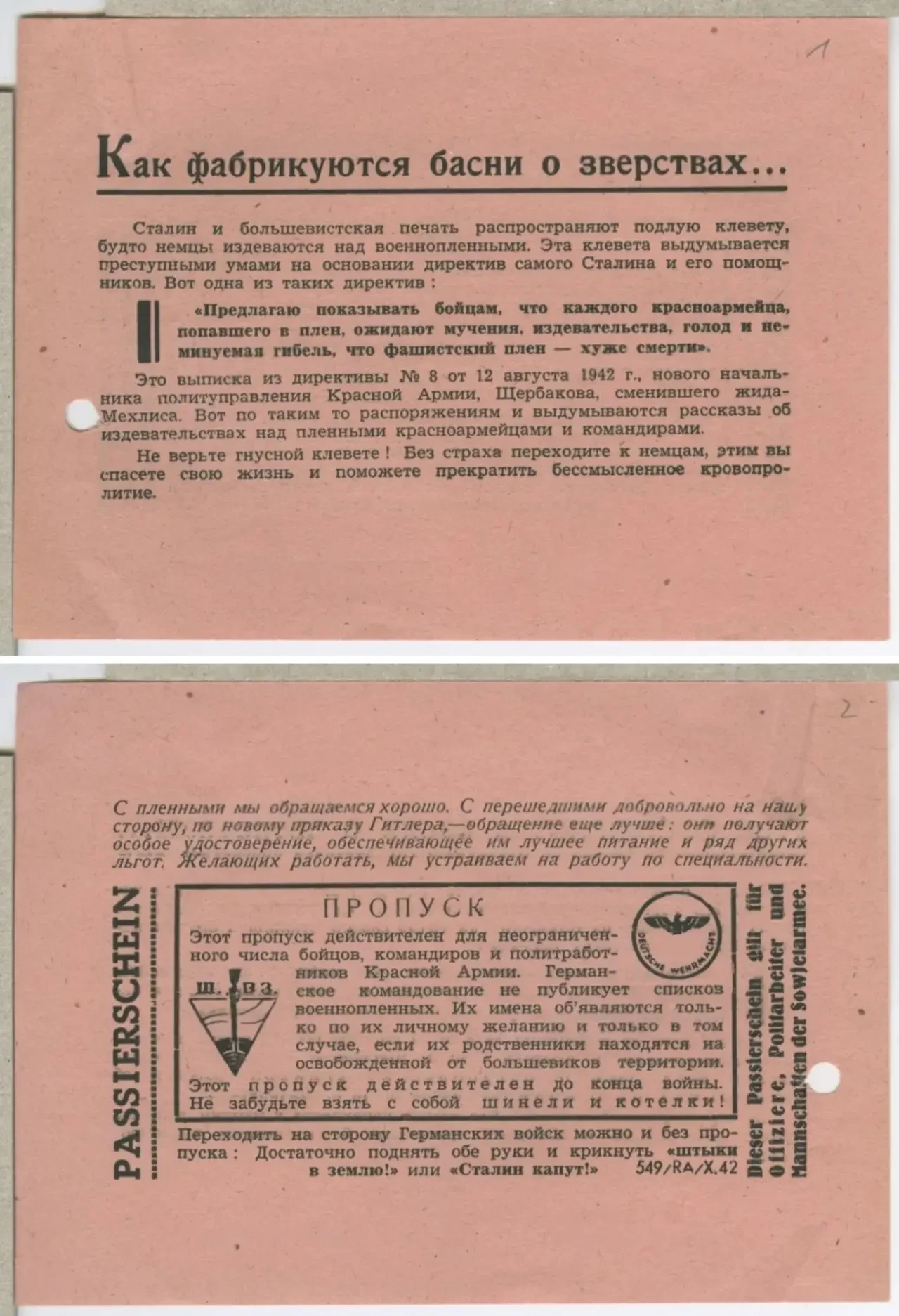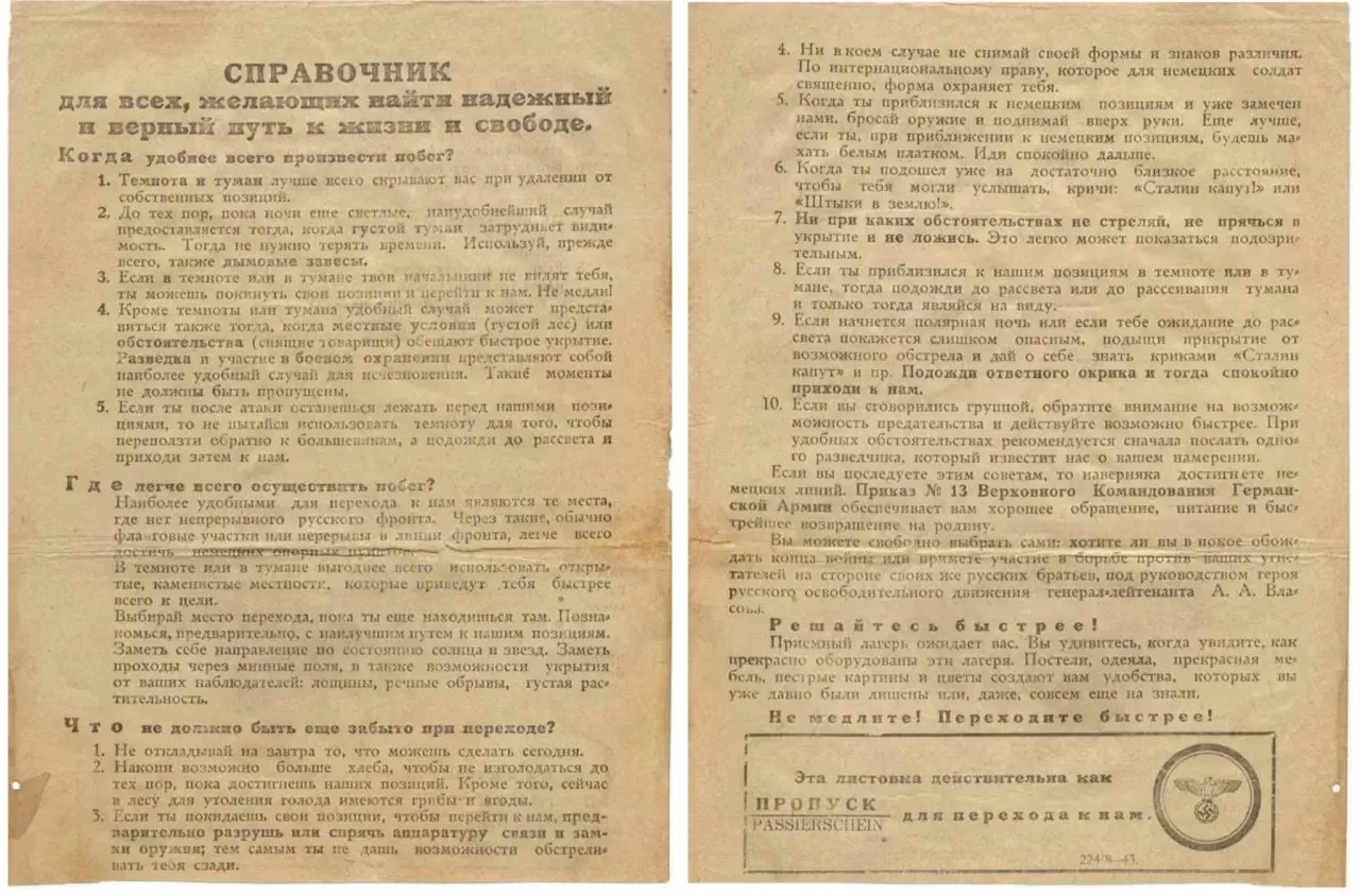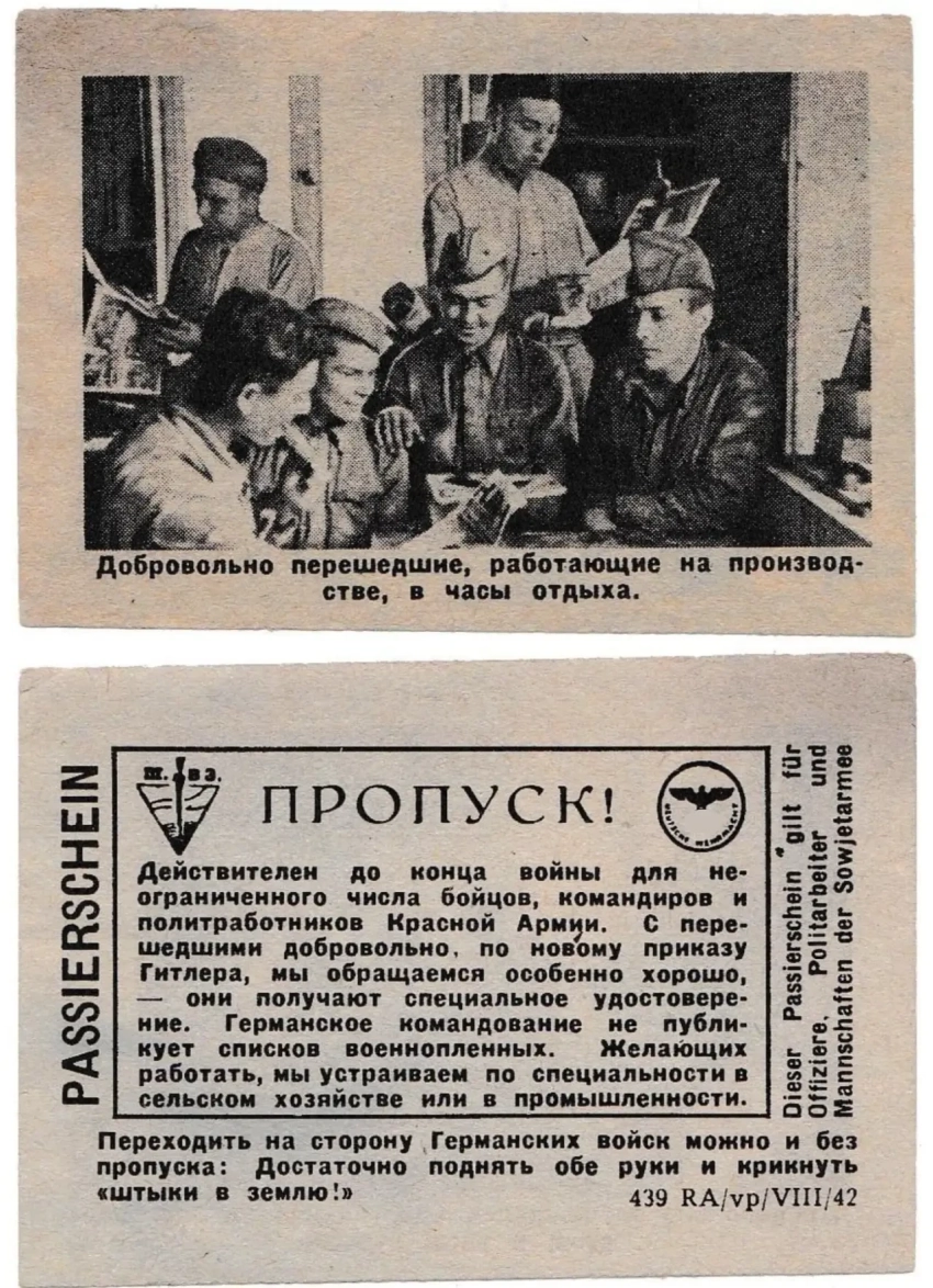 Одной из главных задач почти всех немецких листовок было побудить советских бойцов переходить в плен. На большинстве листовок было изображение пропуска с уточнением, что он действует для неограниченного числа солдат и офицеров (в начале войны по одному пропуску могли перейти до 50 человек). На пропусках была надпись, которую надо было выкрикнуть для обозначения своего намерения перехода к немцам («Штыки в землю!», «Сталин капут!» и другие).