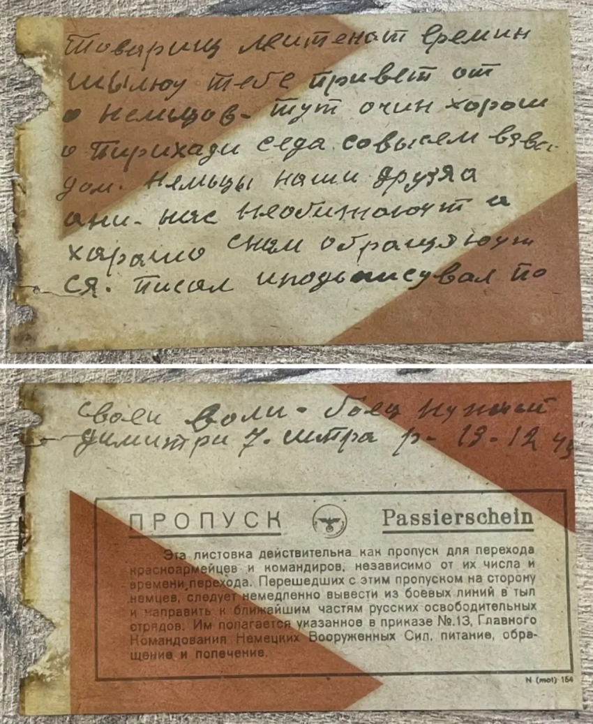 Листовка-шаблон, куда можно было вписать нужный номер полка, имя и подпись как подтверждение написанного. Данные могли вписывать сами немцы, умеющие писать по-русски