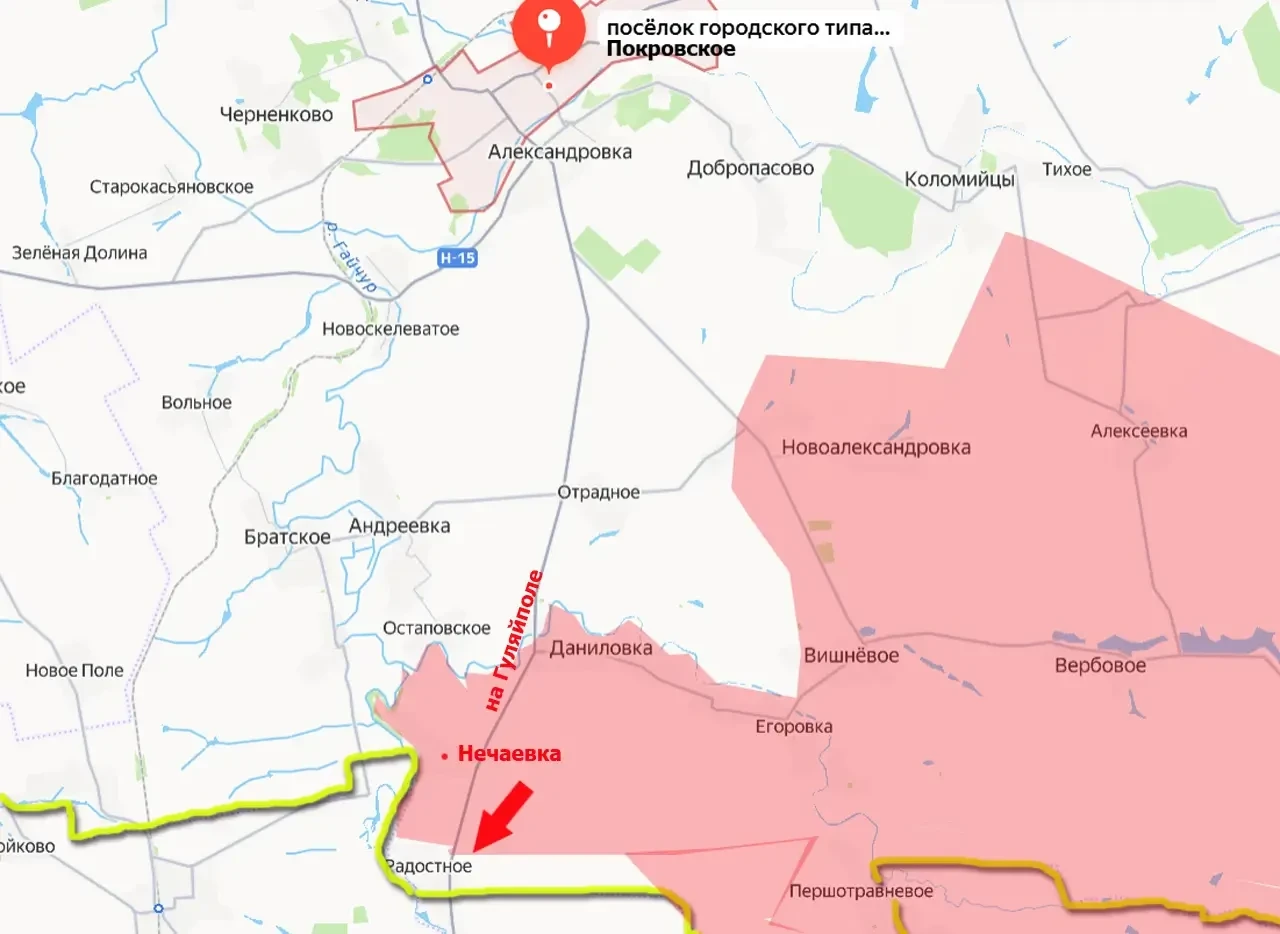 Двигаясь со стороны ранее освобождённой Нечаевки (Днепропетровская область), ВС РФ вплотную подошли к селу Радостное, которое находится непосредственно у границы указанных регионов. Это продвижение позволило увеличить длину участка дороги Покровское-Гуляйполе, перерезанного ВС РФ. А это был главный северный маршрут снабжения гарнизона противника в запорожском Гуляйполе.