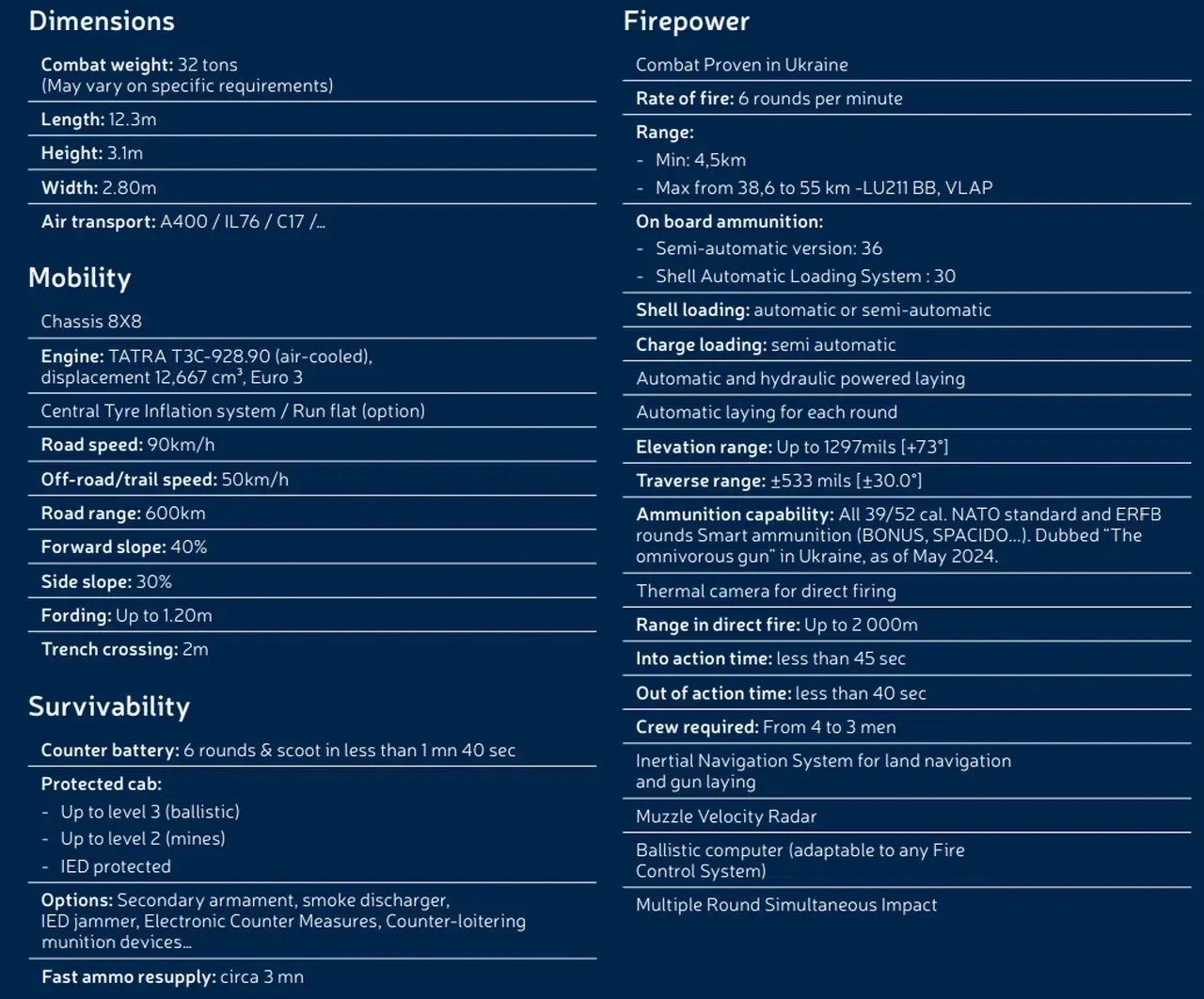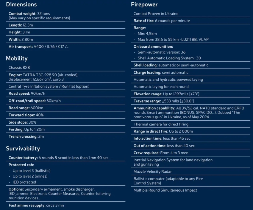Французские обозреватели указывают, что чешская модификация CAESAR имеет свои особенности. Во-первых, их окончательную сборку осуществляет местная компания Excalibur Army в сотрудничестве с Tatra. Во-вторых, в отличие от гаубиц, развёрнутых французской армией и оснащенных СУО ATLAS от концерна Thales, чешский вариант оборудуется СУО Adler III от немецкой компании ESG: