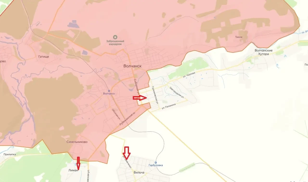Подразделения ВС РФ уже заняли рубежное шоссе, а также продвинулись на восток мимо памятника самолету Л-29. Продолжаются боестолкновения у ангаров на самом юге города. К югу от Волчанска армия России зачистила Синельниково и лесополосы между Синельниково и Вильчей, окончательно закрепив результат на этом участке. Дорога в Волчанск с юга полностью перерезана и недоступна для использования противником. С развитием успеха к югу от Волчанска ВС РФ смогут приблизиться к переправе в Старом Салтове. На восточном фланге продолжаются бои в лесополосах в районе Амбарного, Отрадного и освобожденного недавно Двуречанского.