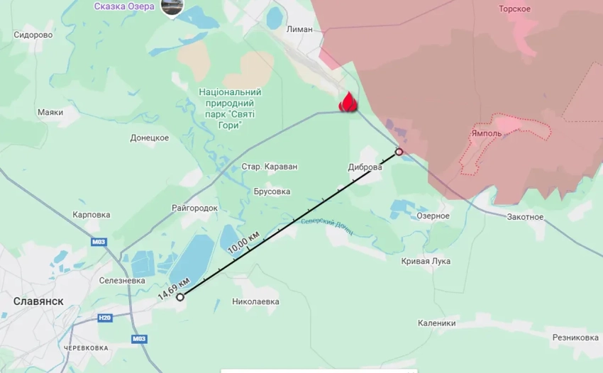 Российские войска, преодолевая насыщенную оборону противника на Лиманском (Краснолиманском) направлении перевели под свой контроль новый участок автомобильной дороги Красный Лиман – Северск. Произошло это юго-западнее ранее освобождённого Ямполя – в направлении населённого пункта Диброва.
