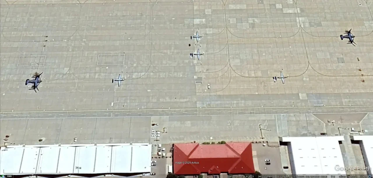 Спутниковый снимок Google Earth: самолёты Pilatus U-28A Draco и конвертопланы Bell Boeing CV-22 Osprey на авиабазе Кэннон. Снимок сделан в мае 2023 года