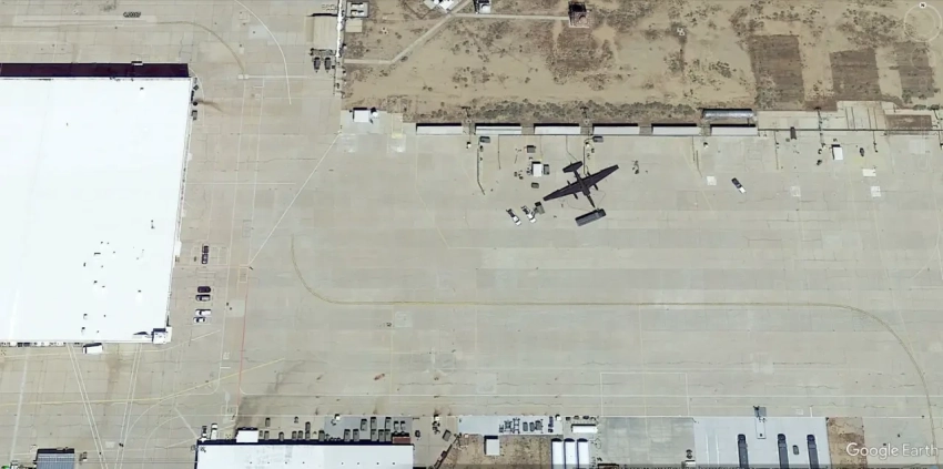 Спутниковый снимок Google Earth: нетипично окрашенный в белый цвет самолёт U-2, летавший в интересах НАСА, среди авиатехники, выведенной из эксплуатации, на стоянке аэродрома Моффетт