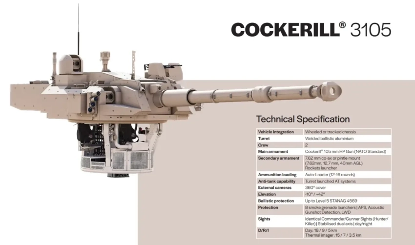 Основная суть концепции состоит в установке новой башни с боевым модулем Cockerill 3105, вооружённым 105-мм пушкой HP Gun, которая способна применять широкий ряд современных боеприпасов, и спаренным с ней 7,62-мм пулемётом. Опционально возможна установка 12,7-мм пулемёта или 40-мм гранатомёта. Большой угол возвышения орудия, составляющий 42°, позволяет вести огонь на дальности свыше 9 км. Как отмечается в западной прессе, новый БМ существенно увеличивает боевые возможности машины: