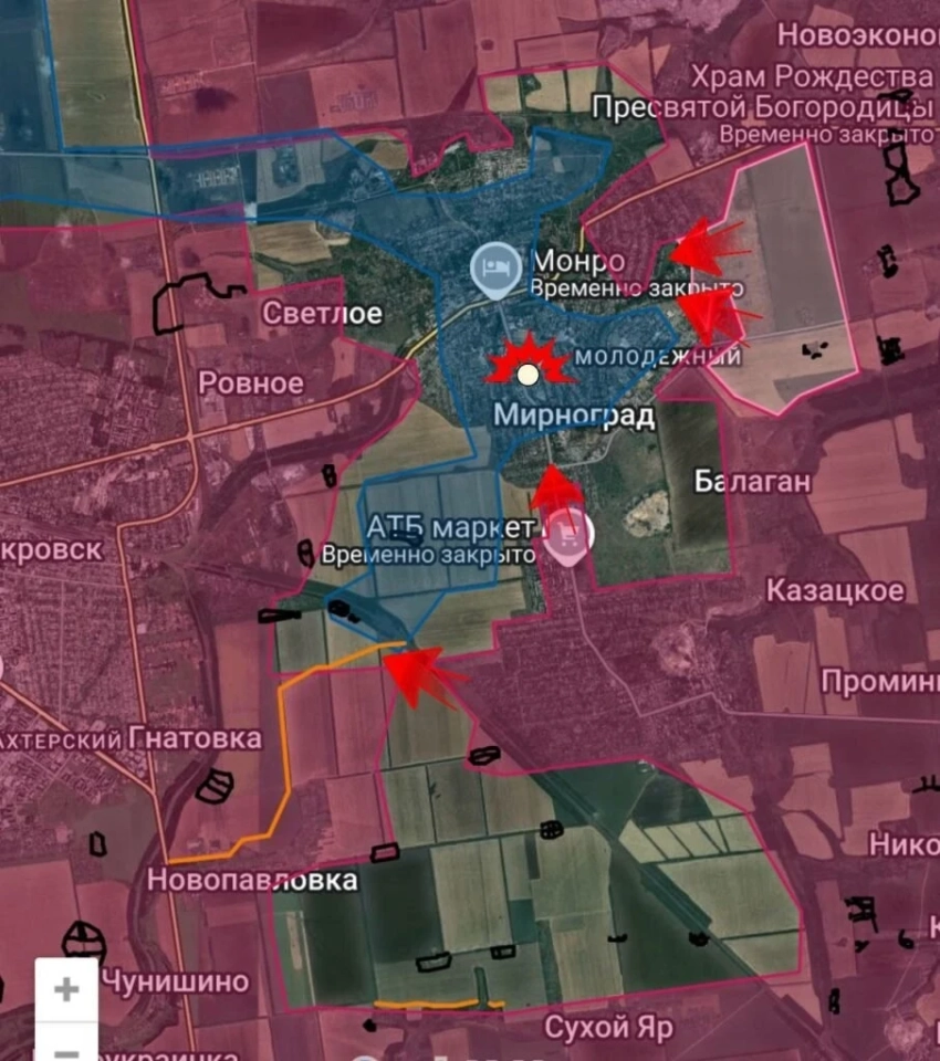 В северо-восточной части Мирнограда российские подразделения продвигаются вперёд. Главным опорным пунктом украинских сил остаётся шахта «Центральная» - мощный укрепрайон в северо-западной части города. Штурмовые группы ВС РФ подошли к нему с северо-востока и с юга, а после завершения зачистки Светлого, где сопротивление противника практически сломлено, выйдут и с западной стороны.