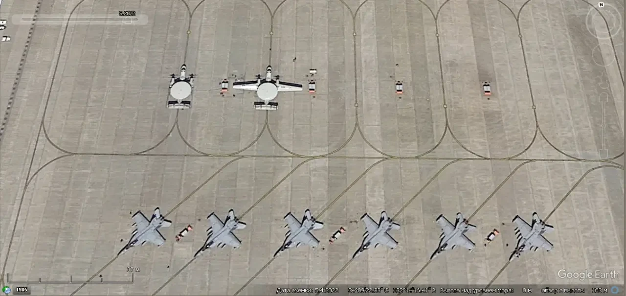 Спутниковый снимок Gооglе Eаrth: самолёты Northrop Grumman E-2С Hawkeye и Boeing F/A-18E/F Super Hornet на авиабазе Фаллон. Снимок сделан в ноябре 2025 года