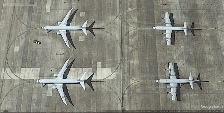 Спутниковый снимок Gооglе Eаrth: самолёты Boeing P-8А Poseidon на авиабазе Кадена. Снимок сделан в мае 2019 года