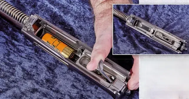 Но и это ещё не всё о заряжании. После того как магазин ружья опустошен, затвор остаётся в заднем положении. Тогда можно просто вложить патрон сбоку через окно выброса. Нажатие на кнопку, расположенную снаружи слева внизу на ствольной коробке, освобождает затвор, и он, захватывая патрон, движется вперёд. После этого ружьё снова можно переломить и заново заполнить магазин описанным способом.