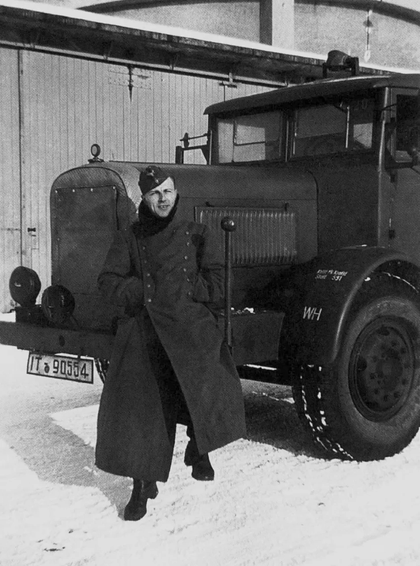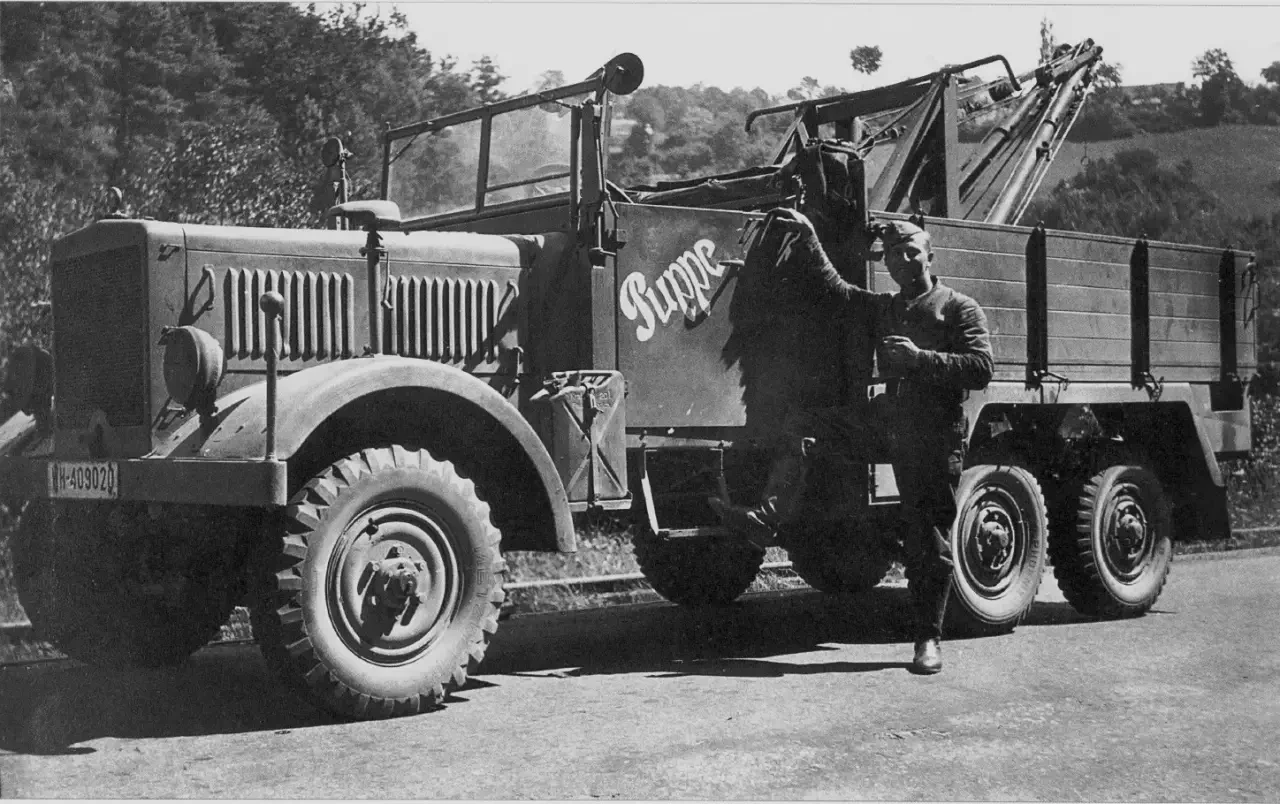 На снимке изображён один из стандартных лёгких полноприводных грузовиков ремонтного подразделения, известный как Einheits-Lkw (единый грузовой автомобиль) или Einheits-Diesel. Это унифицированная модель грузовика грузоподъёмностью 2,5-3 тонны, разработанная в конце 1930-х годов для ремонтных нужд. Машины производили MAN, Magirus, Bussing-NAG, Mercedes-Benz и другие