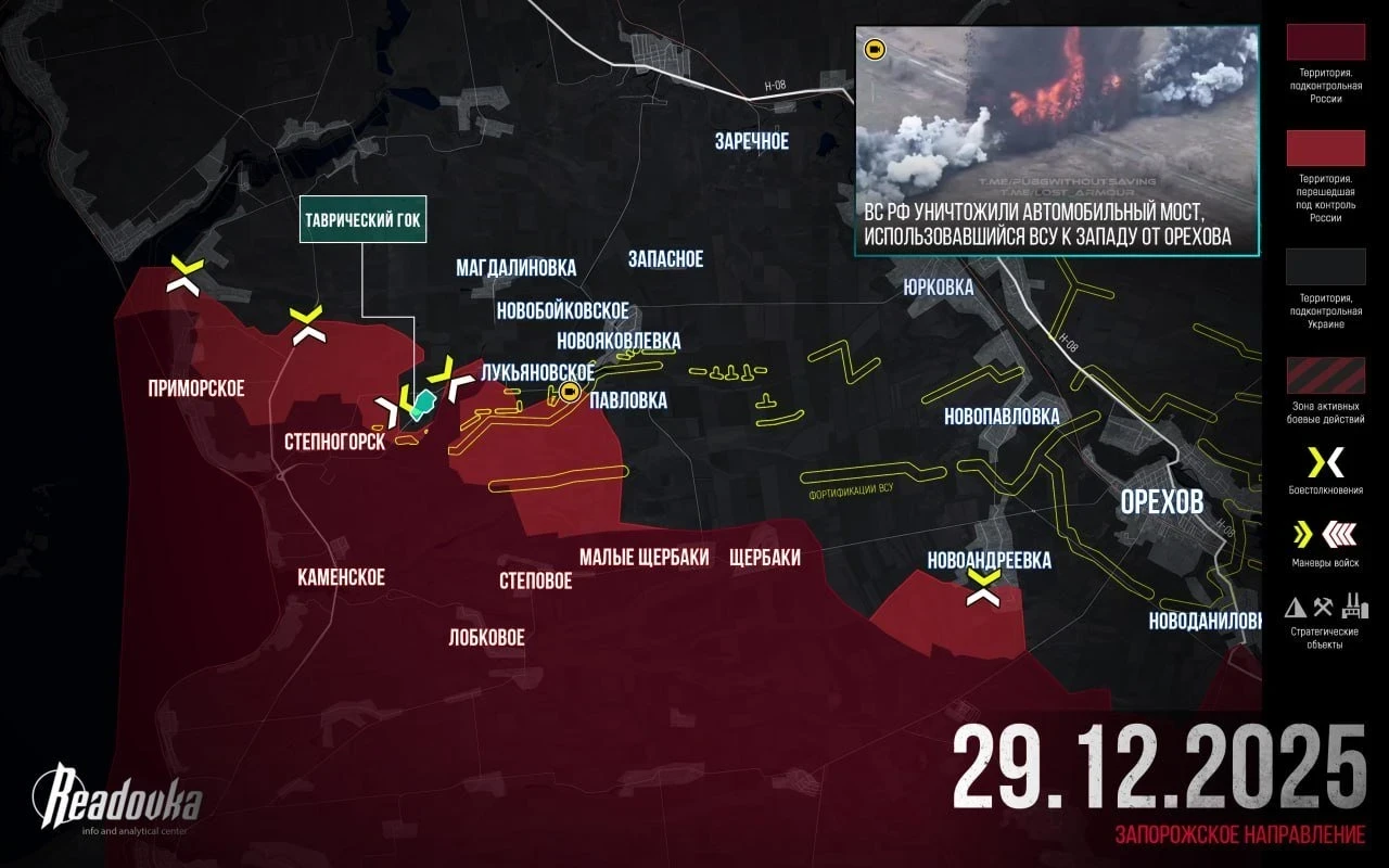 На Запорожском фронте ожесточённые бои в районе Приморского, ВСУ бьются, чтобы не дать ВС РФ прорвать очередной рубеж обороны. Западнее Степногорска наши расширили зону контроля, также есть продвижение вдоль трассы на Запорожье в направлении Веселянки. В районе Лукьяновского ВСУ плотно работают дронами, продвижение даётся тяжело. На сегодняшнем совещании с Путиным командующий группировкой «Днепр» сообщил, что ВС РФ находятся в 15 км от южной окраины Запорожья. Президент поручил продолжить наступление на Запорожье.
