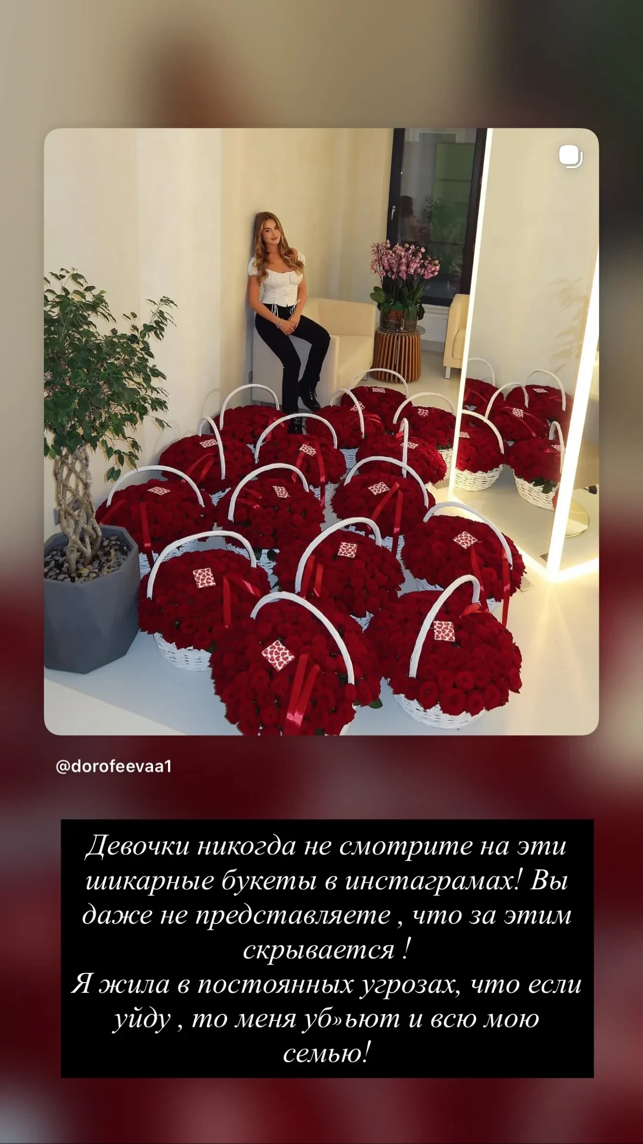 В своём инстаграме* Дорофеева опубликовала архивный снимок с букетами роз от экс-бойфренда, написав: "Девочки, никогда не смотрите на эти шикарные букеты в инстаграмах*! Вы даже не представляете, что за этим скрывается! Я жила в постоянных угрозах, что если уйду, то меня убьют и всю мою семью!".