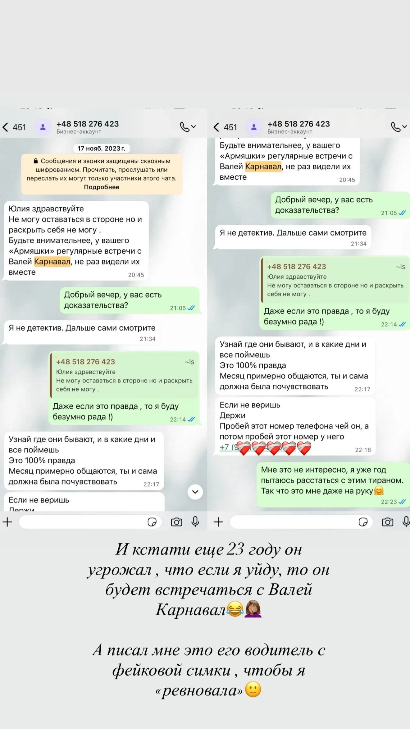 Сторис* Юлии ДорофеевойВ завершение колористка подчеркнула, что ещё до того, как Эвоян начал встречаться с Карнавал, он манипулировал ей, рассказывая через третьих лиц о своих отношениях с популярной тиктокершей.