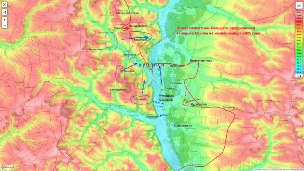 Второе и более приоритетное направление - восточный берег Оскола. Российские подразделения наступают через Песчаное и Куриловку, стремясь выйти к переправам в районе Купянска-Узлового. Успех здесь может серьёзно подорвать устойчивость всей левобережной группировки ВСУ.