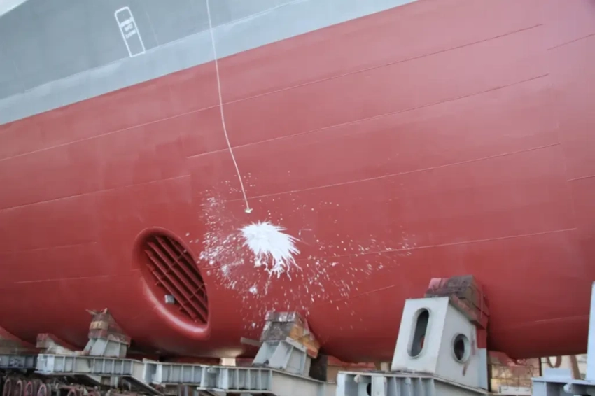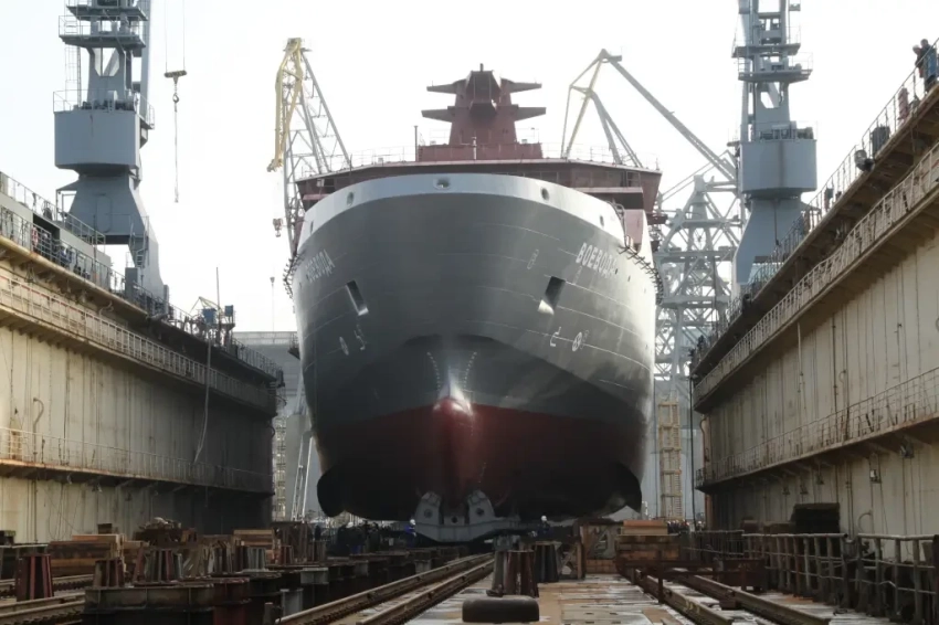 Судно на пути в плавучий док для спуска на воду. Фото ОСК